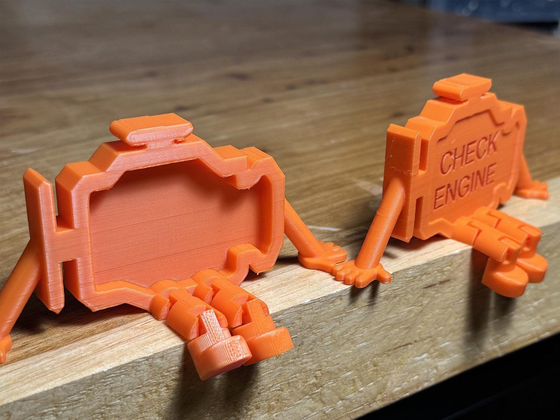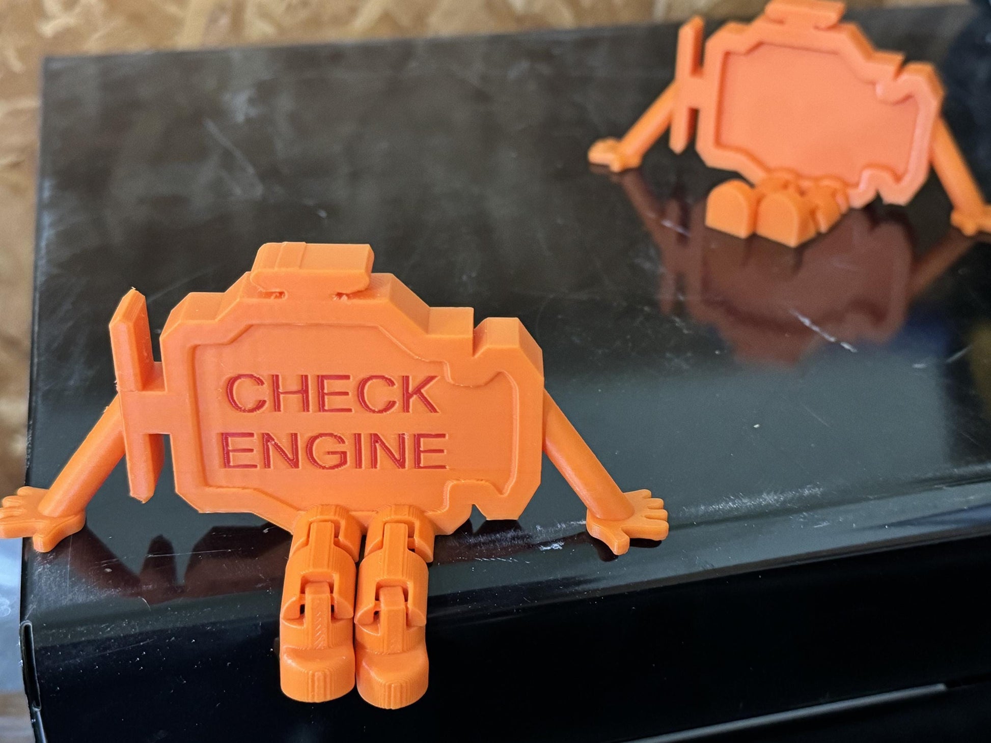 Bring humor to your space with the "Check Engine Light Buddy"! This quirky design features a classic orange check engine light supported by articulating legs and arms, perfect for adding a touch of personality to your desk, car display, gift giving, or tool box.