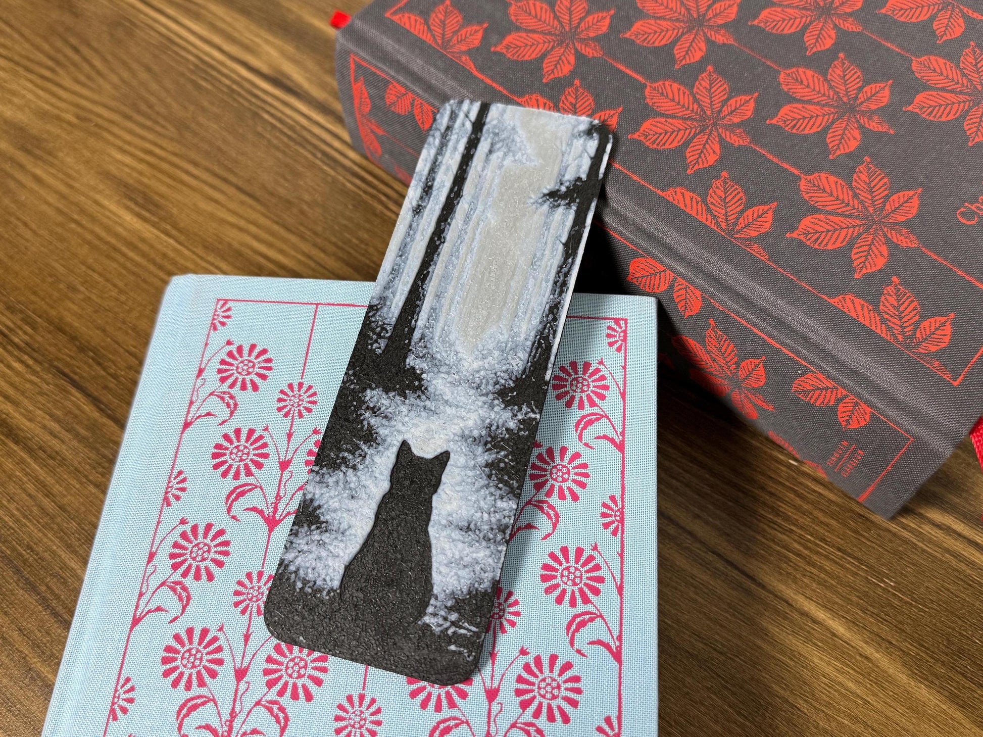 Whiskers in the Mist – Grayscale Forest Cat Bookmark | Moody Hueforge Art for Readers & Cat Lovers